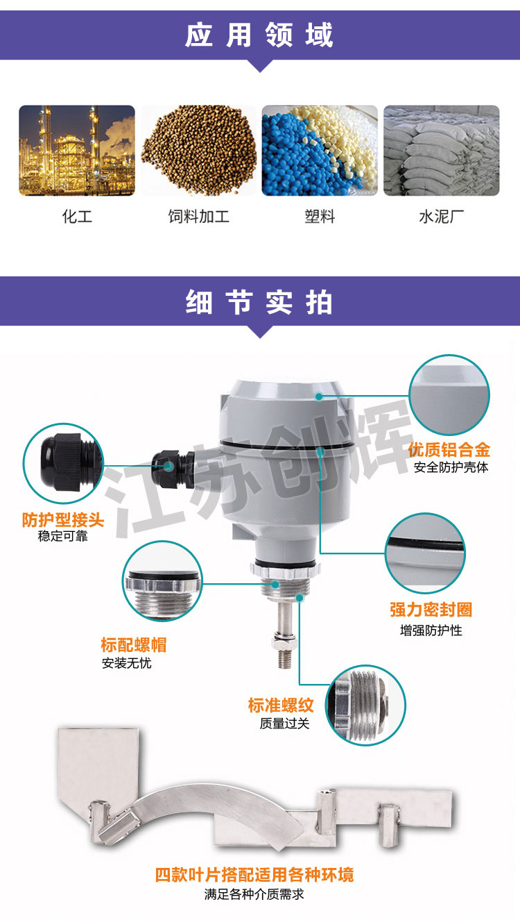 CH-ZX系列阻旋料位開關(guān)是一種用于固態(tài)物料(包括粉狀、粒狀、塊狀、膠狀等)的物位控制器。阻旋料位開關(guān)具有密封性好、過載能力強(具有過載保護)、輕便易裝、輸出觸點容量大等特點。針對不同比重的物料可通過調(diào)整彈簧的拉力來實現(xiàn),其接觸物料部分全為不銹鋼材料。阻旋式料位開關(guān)在化工、塑料、水泥、制藥、飼料、食品等行業(yè)得到了**的應(yīng)用。江蘇創(chuàng)輝儀表是**的阻旋料位開關(guān)廠家,價格咨詢電話15358667860。