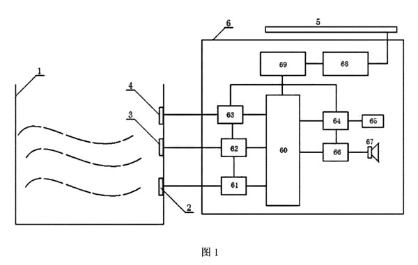 運(yùn)行時,報警器6及太陽能電池5安裝在泥漿儲罐頂部,將網(wǎng)絡(luò)接口65與指揮中心電腦通過網(wǎng)絡(luò)連接,工作人員即可坐在辦公室內(nèi)觀察泥漿儲罐液位,并能實現(xiàn)全天候自動監(jiān)控工作;泥漿液位到達(dá)第 一傳感器2、第 二傳感器3或第三傳感器4時,其液位信號就會傳送給中央處理器60,中央處理器60通過網(wǎng)絡(luò)接口65匯報給指揮中心,當(dāng)液位過高或過低時,中央處理器60即會通過喇叭67報警,指揮中心還能通過網(wǎng)絡(luò)對現(xiàn)場喊話,方便指揮,極大的減輕工作人員的勞動強(qiáng)度,具有很好的推廣使用價值。